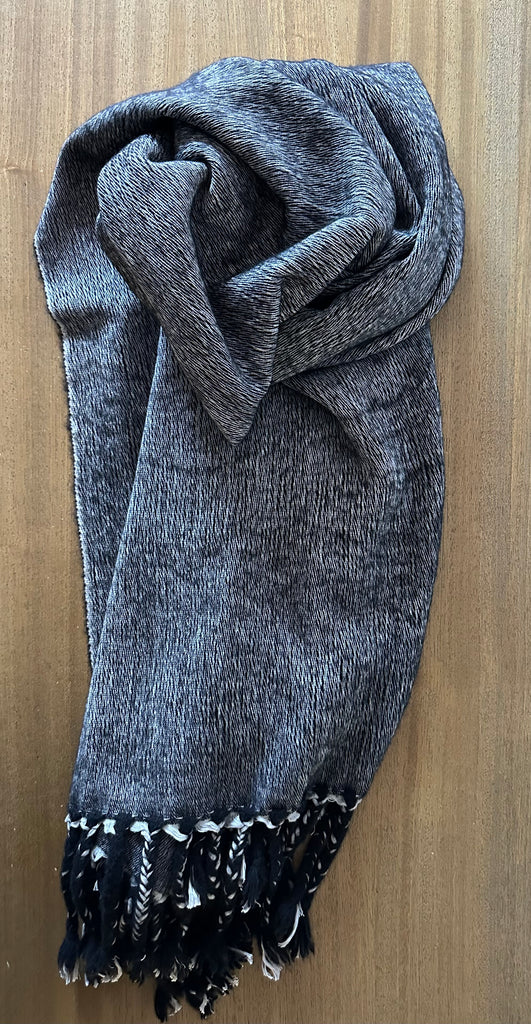 The Tukche Yak Wool Wrap is incredibly soft. It is a timeless, perfect neutral throw in dark slate featuring braided fringe edge inspired by the Thakol region in Mustang, Nepal near the Tibetan border. These Thakali pieces are forever favorites and are incredibly well made. Each piece is hand woven using specialized Thakali spinning and weaving techniques. The tukche yak wool wrap will last for decades with care.